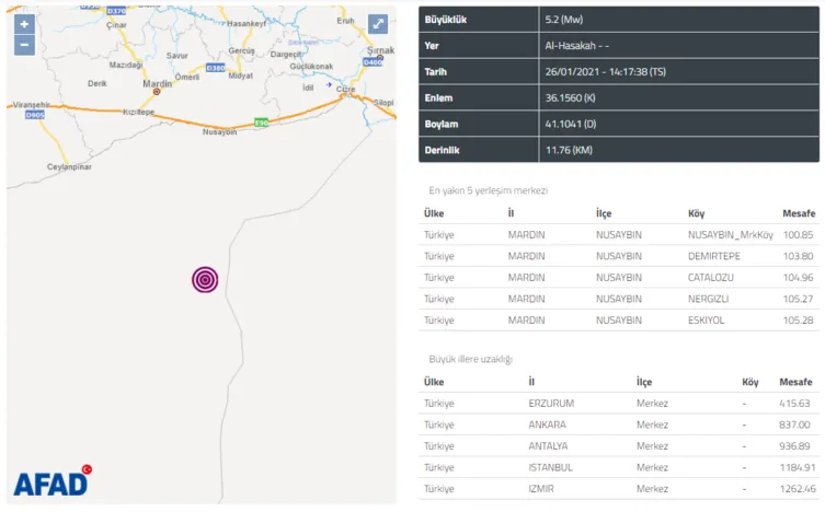 AFAD son depremler verilerine göre, saat 14.17’de meydana gelen depremin merkez üssü Suriye’nin Al-Hasakah kenti olarak duyuruldu. AFAD, depremin derinliğini 11.76 km olarak kamuoyuna açıkladı. AFAD ayrıca, depremin şiddetini 5.2 olarak paylaştı.