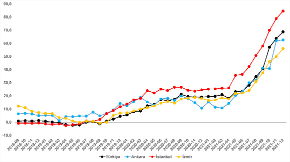 TÜİK, Aralık ayındaki enflasyon oranını %36,08 olarak açıkladı. En düşük kira artış oranları hesaplanan beş büyükşehirdeki yıllık kira artış oranının yıllık enflasyon oranından düşük olması dikkat çekmektedir. Dolayısıyla, bu illerde son bir yılda kiraya verilen konutların ortalama kira getirileri reel anlamda değer kaybetti.