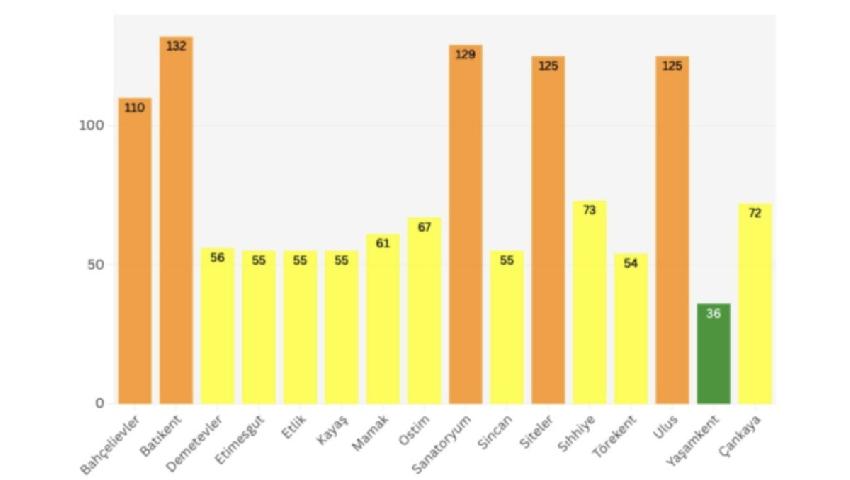 NEFES uygulamasının verilerine göre, ulusal sınırı en fazla 50 olması gereken metreküp başına hava kirletici partikül miktarı, bugün Ankara’da semtlere göre farklılık gösterdi.