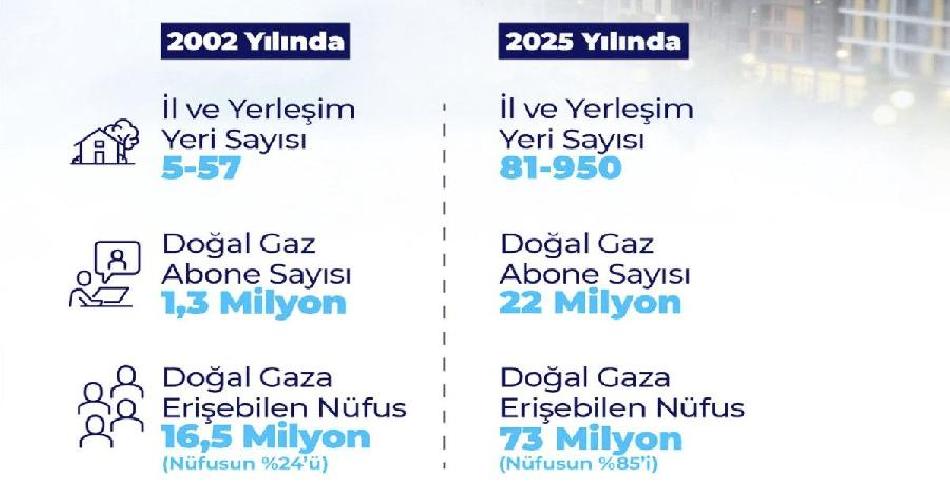 2002’de 1,3 milyon olan doğalgaz abone sayısı, bugün itibarıyla 22 milyona yükseldi. Son 1 yılda 51 yerleşim yerine doğalgaz arzı sağladık ve Türkiye genelinde konut abone sayısı da yaklaşık 1 milyon arttı.” değerlendirmesinde bulundu.