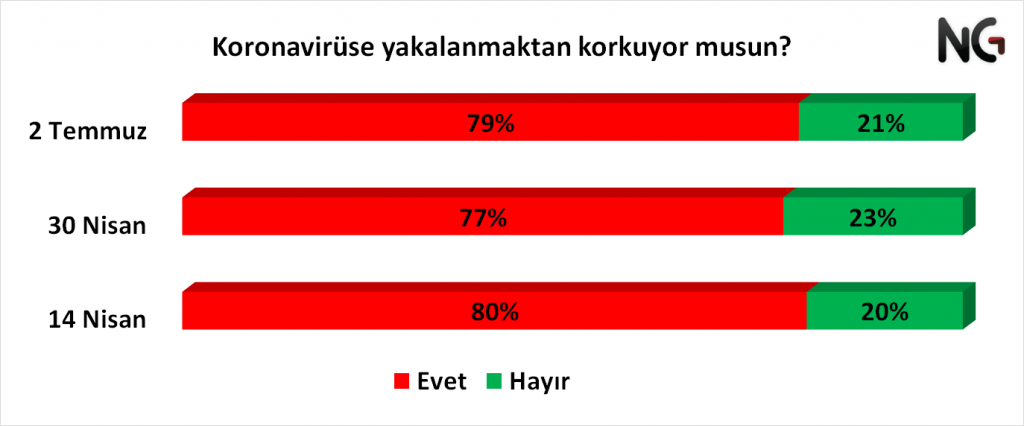 Yaptığımız son 3 araştırmada oranlar yaklaşık olarak aynı kaldı. Araştırmamızın sonuçlarına göre her 5 kişiden 4’ü koronavirüse yakalanmaktan korktuğunu belirtti.