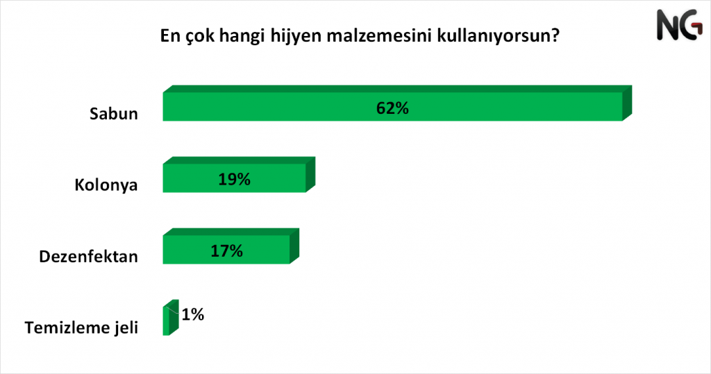 Peki en çok hangi hijyen malzemesini tercih ediyoruz? Her 5 kişiden 3’ü sabun, 1’i ise kolonya tercih ediyor. Sabun ve kolonya arkasından ise dezenfektan geliyor.