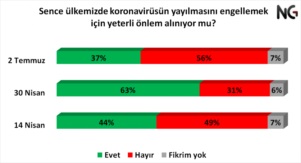 30 Nisan’daki araştırmamızda iyimsere giden bir tablo varken 2 Temmuz’daki son araştırmamızda bu tablo tersine dönmüş görünüyor. Normalleşme süreciyle beraber çoğunluk yeterli önlemlerin alınmadığı yönünde görüş değiştirmiş durumda. Bu duruma paralel bir değişim de yapılan test sayılarının yeterliliği ile ilgili. Bir önceki araştırmamızda test sayısını yeterli bulanların oranı %49 iken son durumda bu sayı %38’e düşmüş durumda.