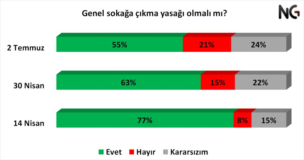 Haftasonu sokağa çıkma yasağına yaklaşımda çok büyük farklılıklar oldu. 30 Nisan’daki araştırmamızda yasağı destekleyenlerin oranını %83 iken, bu araştırmamızda oranın %43’e düştüğünü görüyoruz. Kararsızların oranı ise 2 katından daha fazla arttı.