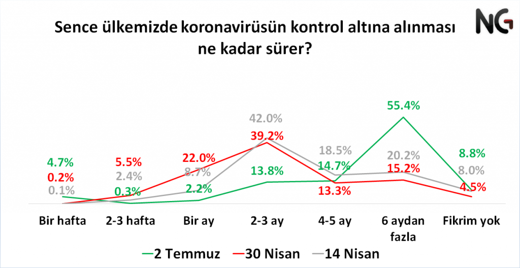 Son 2 ayda geçen süre bu konudaki beklentilerde ciddi farklılıklar oluşturdu. Bir aydan kısa sürede koronavirüsün kontrol altına alınacağını düşünenlerin oranı son 2 ay içinde yaklaşık olarak aynı kaldı. En belirgin fark salgının birkaç ay içinde kontrol altına alınacağını düşünenlerin, ağırlıklı olarak 6 aydan daha uzun bir süreye kayması oldu. Son durumda katılımcıların yarısından fazlası salgının kontrol altına alınabileceği sürenin 6 aydan daha uzun olduğunu düşünüyor.