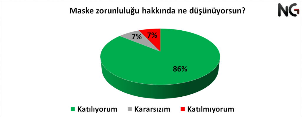 Maske takma zorunluluğu %86 oranında destek gördü. Araştırma sonuçlarına göre toplum genelinde benimsenen bir uygulama olduğu görülüyor.