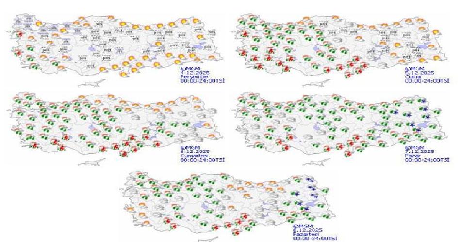 Meteoroloji Genel Müdürlüğü tarafından yapılan tahminlere göre: Ülkemizin iç ve batı kesimlerinin parçalı, yer yer çok bulutlu, Kıyı Ege ile Çanakkale, Balıkesir’in batı kıyı ilçeleri, Manisa, Denizli, Antalya, Burdur ve Isparta çevrelerinin sağanak ve gök gürültülü sağanak yağışlı, diğer yerlerin az bulutlu ve açık geçeceği tahmin ediliyor. Yağışların, İzmir, Aydın ve Muğla’nın kıyı kesimlerinde yer yer kuvvetli olması bekleniyor. Bu sabah ve gece saatlerinde Marmara ile iç ve doğu kesimlerde pus ve yer yer sis hadisesinin görüleceği tahmin ediliyor. Sabah ve gece saatlerinde İç Anadolu’nun kuzeydoğusu ile Doğu Anadolu’nun kuzey ve doğusunda buzlanma ve don olayı bekleniyor.