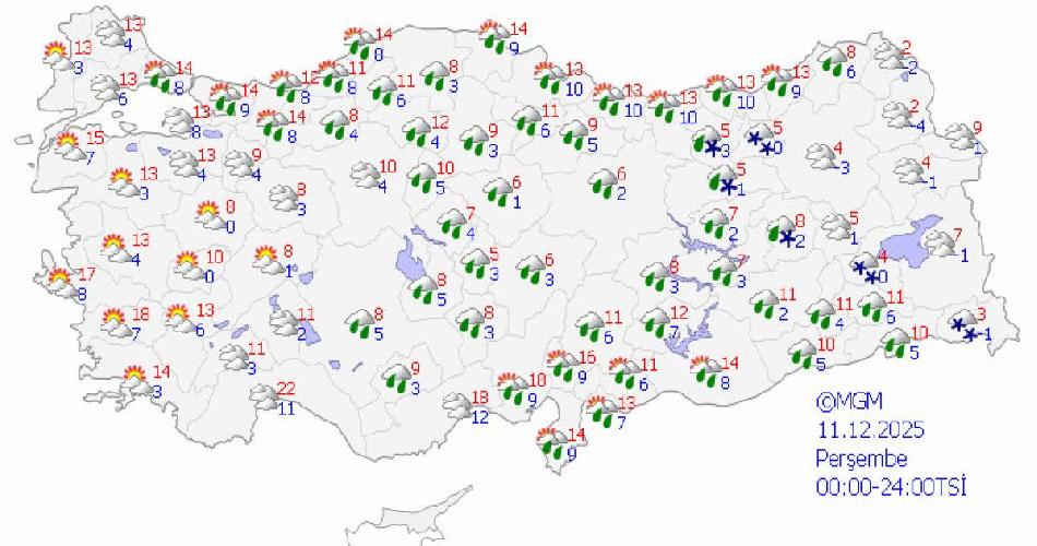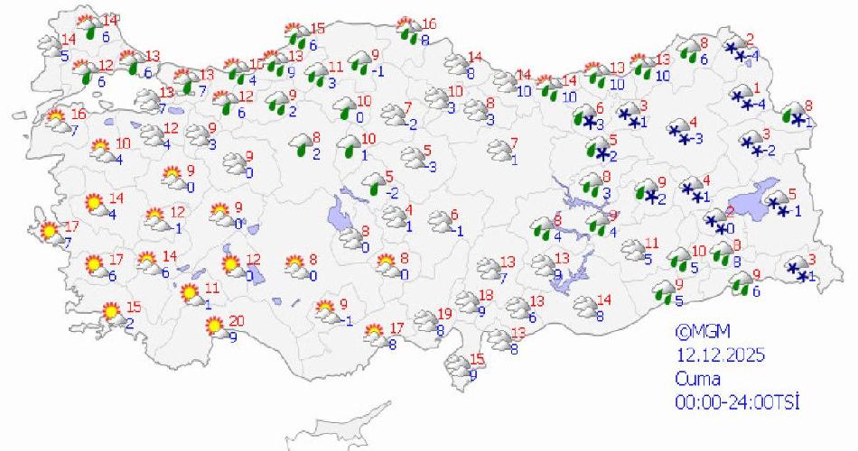 Kar yağışı simgeleri doğu illerde yoğunlaşırken, ülke genelinde soğuk ve bulutlu hava koşulları devam edecek.