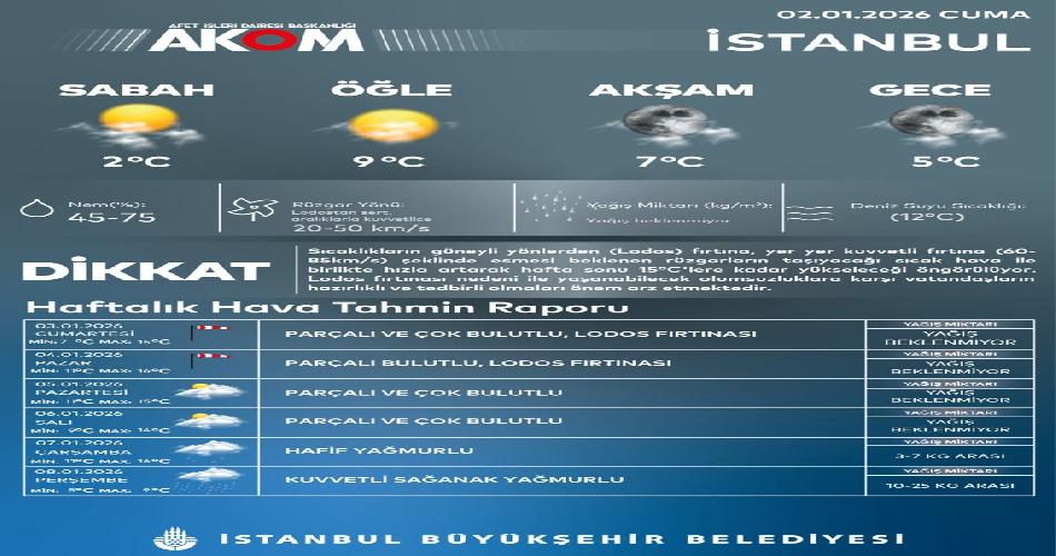 AKOM, son raporunda özellikle rüzgâra dikkat çekiyor. Lodosun zaman zaman sert, yer yer kuvvetli fırtına şeklinde (60-85 km/s) esebileceği belirtilirken, haftanın ikinci yarısında ise hava yeniden değişiyor: Çarşamba günü hafif yağmur, perşembe günü ise kuvvetli sağanak yağış bekleniyor.
