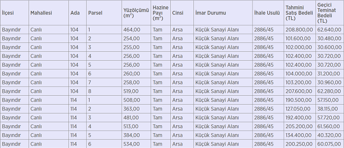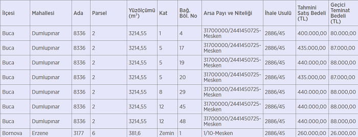 İzmir Milli Emlak Müdürlüğü, Bucave Bornova’da bulunan 8 adet kamu konutu ile Bayındır’da bulunan 14 adet küçük sanayi alanı imarlı arsayı açık artırma ile satışa çıkardı. Konutların ve arsaların ihalesi 16 eylülde gerçekleşecek.
