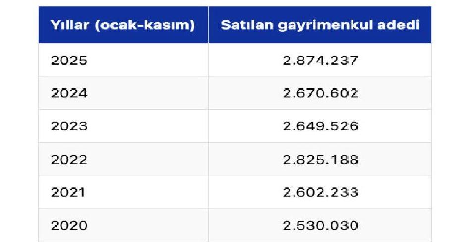 Ülke genelinde 2020-2025 yılları ocak-kasım dönemleri dikkate alındığında satılan gayrimenkul adetleri şöyle: