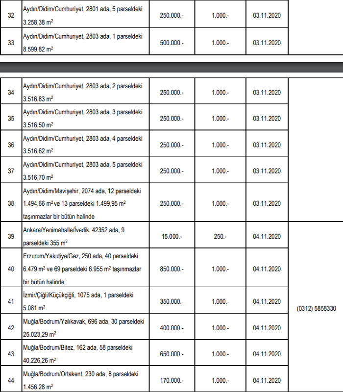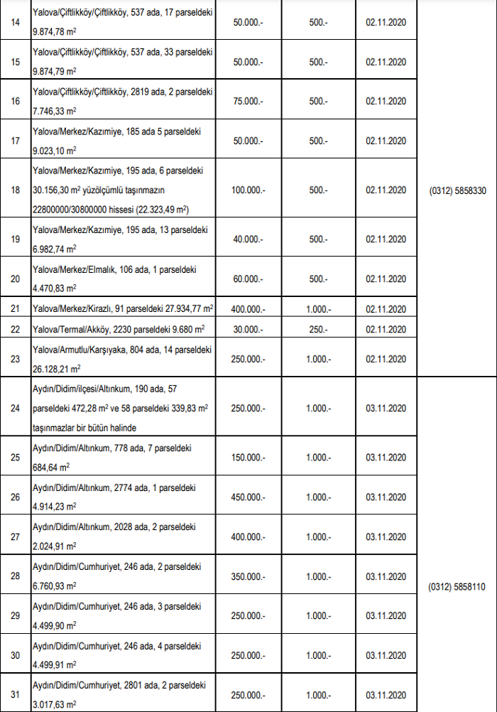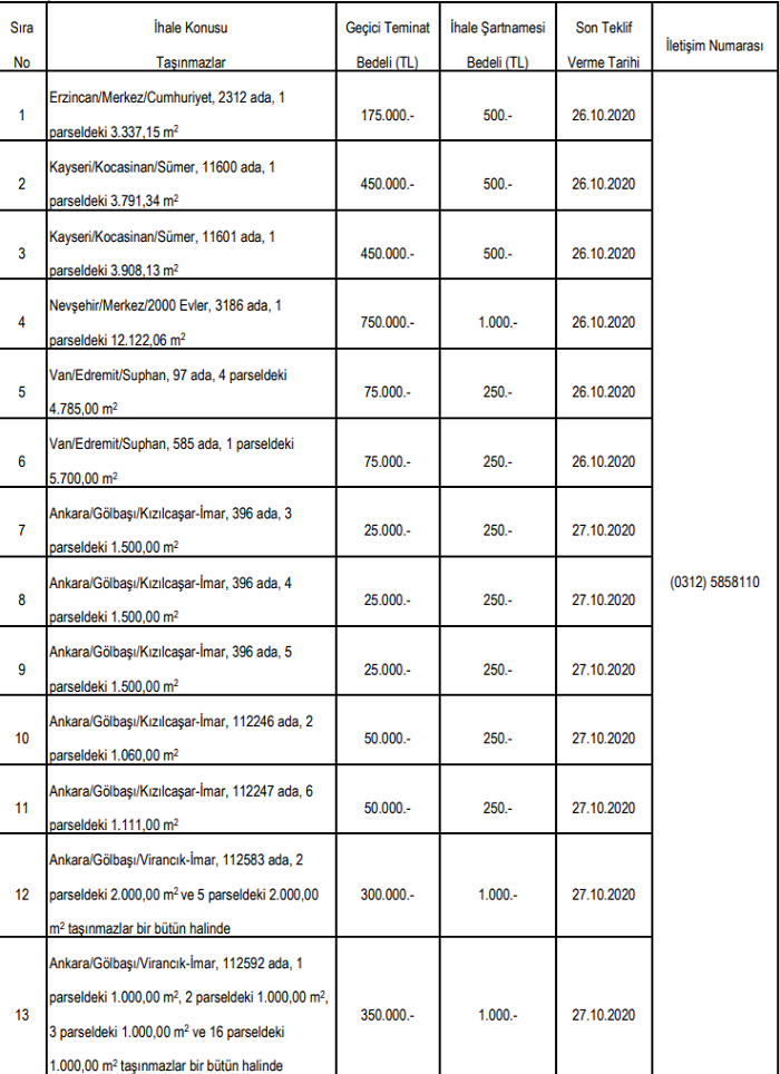 Buna göre, Aydın, Ankara, Erzincan, Van, Kayseri, Nevşehir, Yalova, Erzurum, İzmir ve Muğla’da yer alan 44 taşınmaza ilişkin satış ihaleleri, birden fazla teklif sahibinden kapalı zarfla teklif alma, görüşme ve pazarlık usulüyle gerçekleştirilecek.