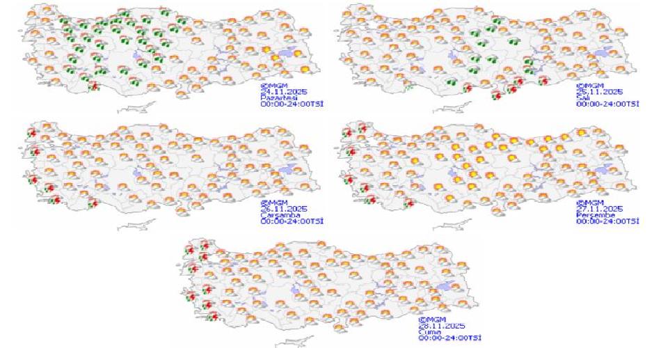 Öte yandan, Marmara, Ege, Akdeniz ve Karadeniz’in kıyı şeritlerinde hafta boyunca yer yer sağanak yağışlar etkili olacak. Yetkililer, özellikle Pazartesi, Salı ve Cumartesi günlerinde batı bölgelerde kuvvetli sağanak yağışlar görülebileceği konusunda uyarıyor.