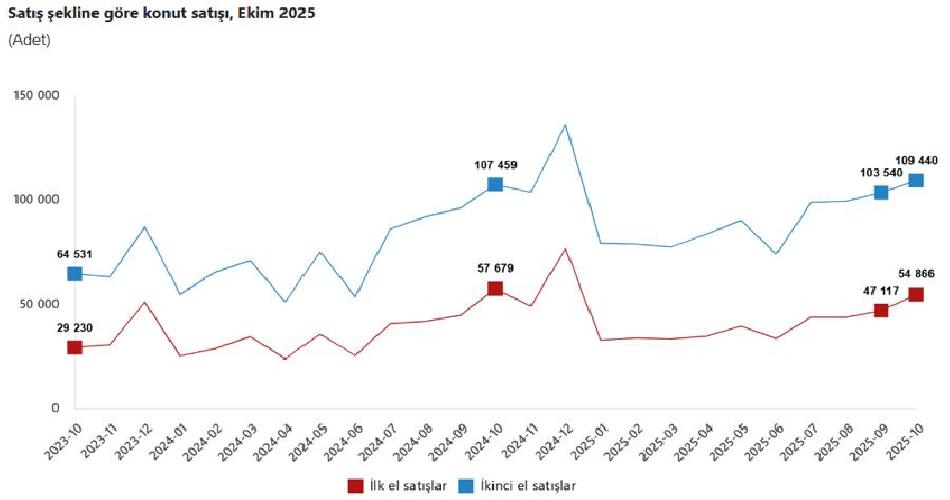 Türkiye genelinde ilk el konut satış sayısı Ekim ayında bir önceki yılın aynı ayına göre yüzde 4,9 oranında azalarak 54 bin 866 oldu.
