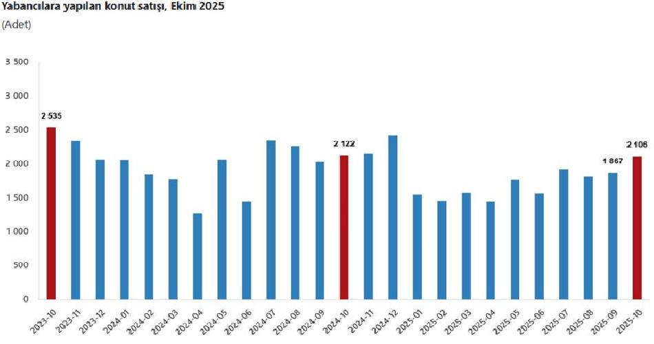 Yabancılara yapılan konut satışları Ekim ayında bir önceki yılın aynı ayına göre yüzde 0,8 oranında azalarak 2 bin 106 oldu.