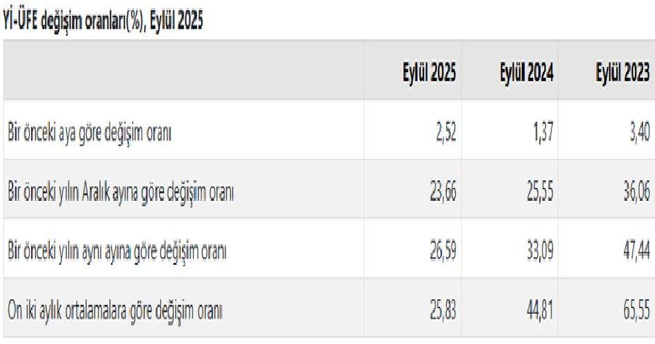 Buna göre Yİ-ÜFE (2003=100), eylülde bir önceki aya kıyasla yüzde 2,52, geçen yılın aralık ayına göre yüzde 23,66, geçen yılın aynı ayına göre yüzde 26,59 ve on iki aylık ortalamalara göre yüzde 25,83 artış gösterdi.
