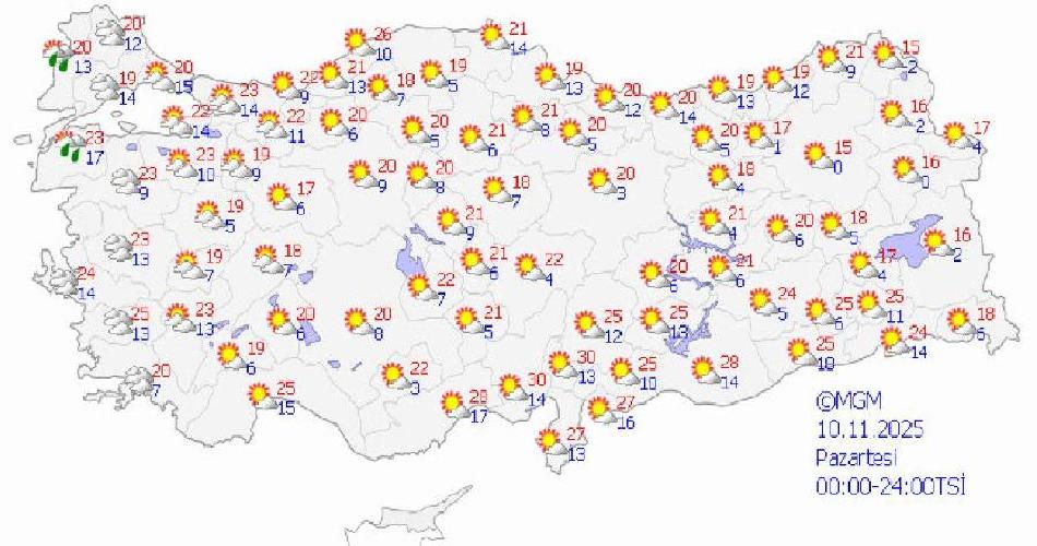 10 Kasım Pazartesi günü, ülke genelinde parçalı ve az bulutlu hava etkili.