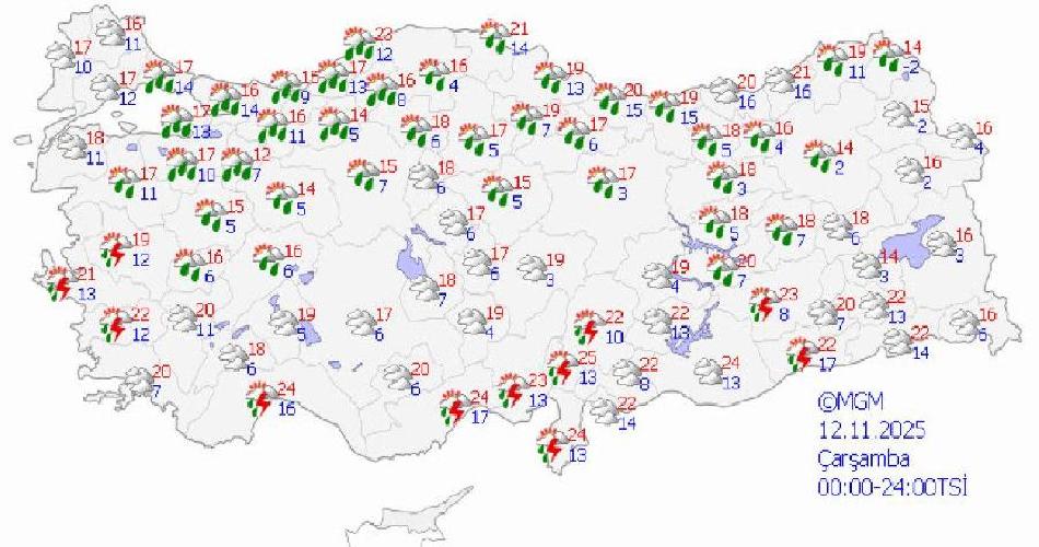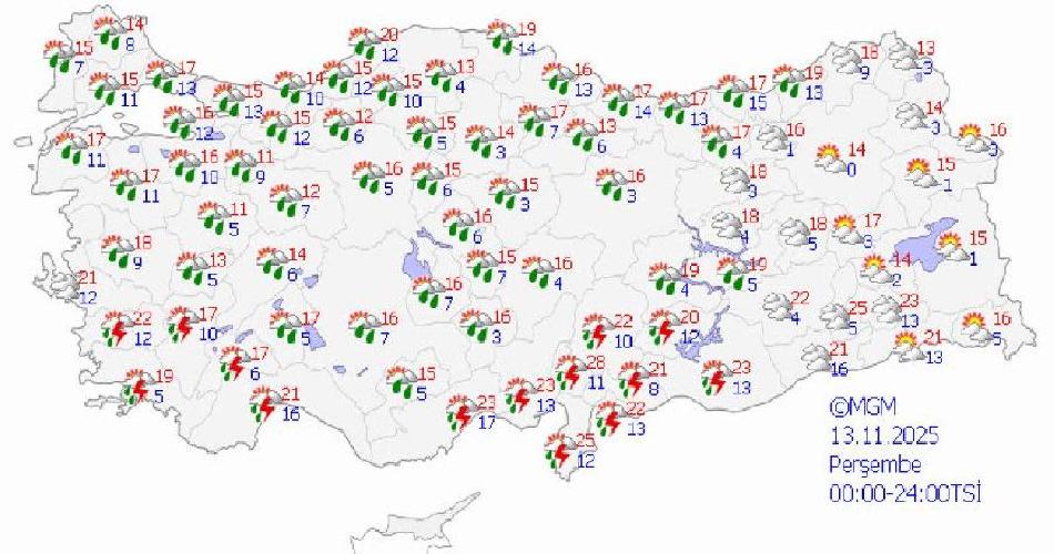 13 Kasım Perşembe günü yağışlar azalacak ancak Ege kıyıları ve Akdeniz’in yer yer sağanaklı olacağı tahmin ediliyor.