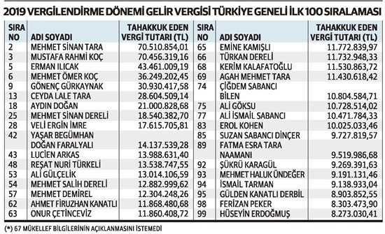 Gelirler vergisi rekortmenleri ilk 100 listesinde inşaat sektöründen toplamda 2 şirketten 5 isim yer aldı. Enka İnşaat yönetim kurulu başkanı Mehmet Sinan Tara 70 milyon 510 bin TL vergi tahakkuk ederek 2. sırada yer aldı. Listenin 5. sırasında yer alan Rönesans Holding yönetim kurulu başkanı Erman Ilıcak 43 milyon 461 bin TL tahakkuk etti. Enka İnşaat’ın hissedarlarından olan Ceyda Lale Tara 28 milyon 604 bin TL tahakkukla 23. sırada, Agah Mehmet Tara 11 milyon 430 bin TL tahakkuk ile 69. sırada, Fatma Esra Tara Naamani 9 milyon 519 bin TL tahakkukla 89. sırada yer aldı.