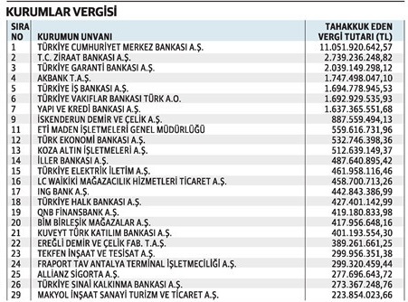 Kurumlar vergisi ödemeleri listesinde ilk 30 sırada inşaat sektöründe faaliyet gösteren 4 firma yer aldı. Listesinin ilk 7 sırasında bankalar yer alırken 9. sırada 887 milyon 559 bin TL tahakkuk ile İskenderun Demir Çelik yer aldı.